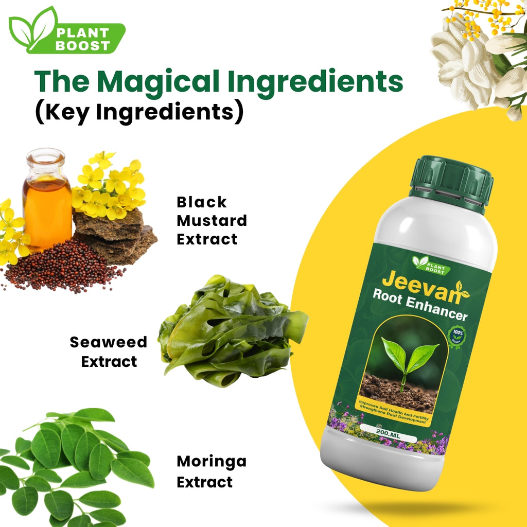 Plant Boost JEEVAN Root Enhancer is a specially formulated bio-stimulant designed to energize root growth, revive plant life, and maximize yield—even in unfavorable soil or weather conditions. It strengthens the very foundation of your plants by activating root cells, improving nutrient absorption, and ensuring healthier plant development from the ground up.