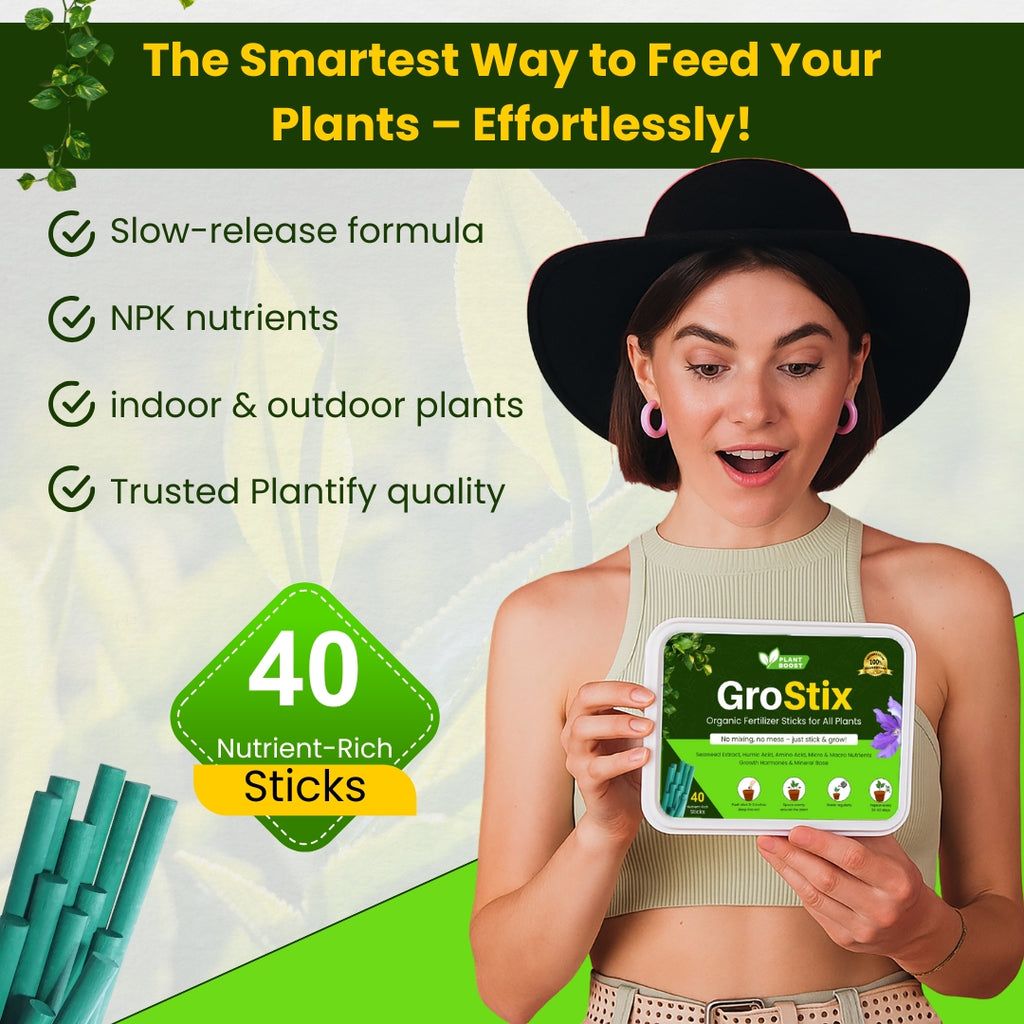 Plant Boost GroStix are slow-release organic plant food sticks made for both indoor and outdoor plants. They provide essential nutrients gradually over time to support healthy growth, greener leaves, and stronger roots.